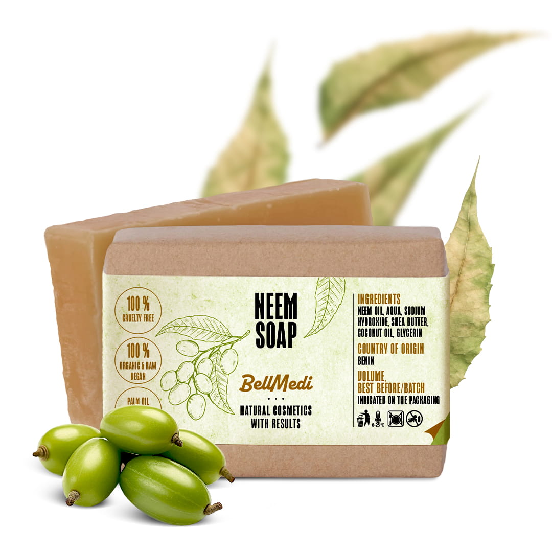 A neemolajat évszázadok óta alkalmazzák bőrproblémák kezelésére. Bioaktív hatóanyagokat tartalmaz, köztük az azadirachtint és E-vitamint, amelyek antibakteriális, antiszeptikus és gombaellenes hatással rendelkeznek. A szappan segít helyreállítani a bőr természetes egyensúlyát, csökkenti az irritációt, és támogatja a bőr természetes regenerációs folyamatait.
